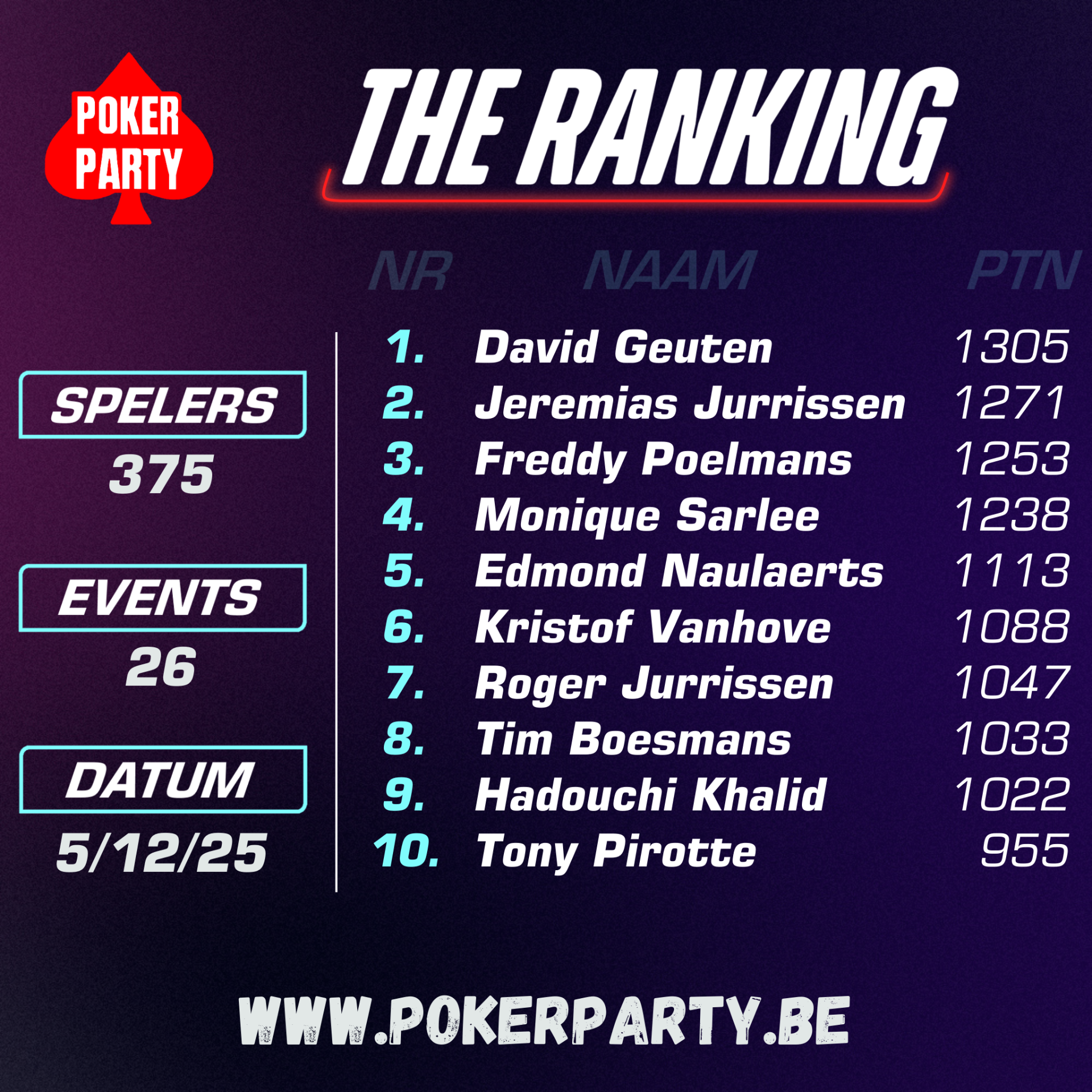 DE RANKING IS een EXTRA bovenop de prijzenpot die we na elk toernooi uitkeren !
